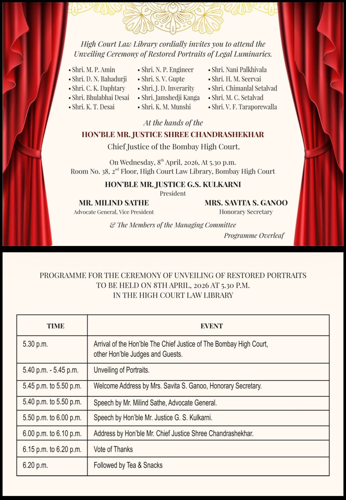 The Bombay High Court Law Library has formally sent out an invitation for the unveiling of restored portraits of legendary legal figures on 8 April 2026 at 5:30 p.m. The ceremony will be graced by Justice Shree Chandrashekhar and members of the Bench and Bar, followed by tea and refreshments.